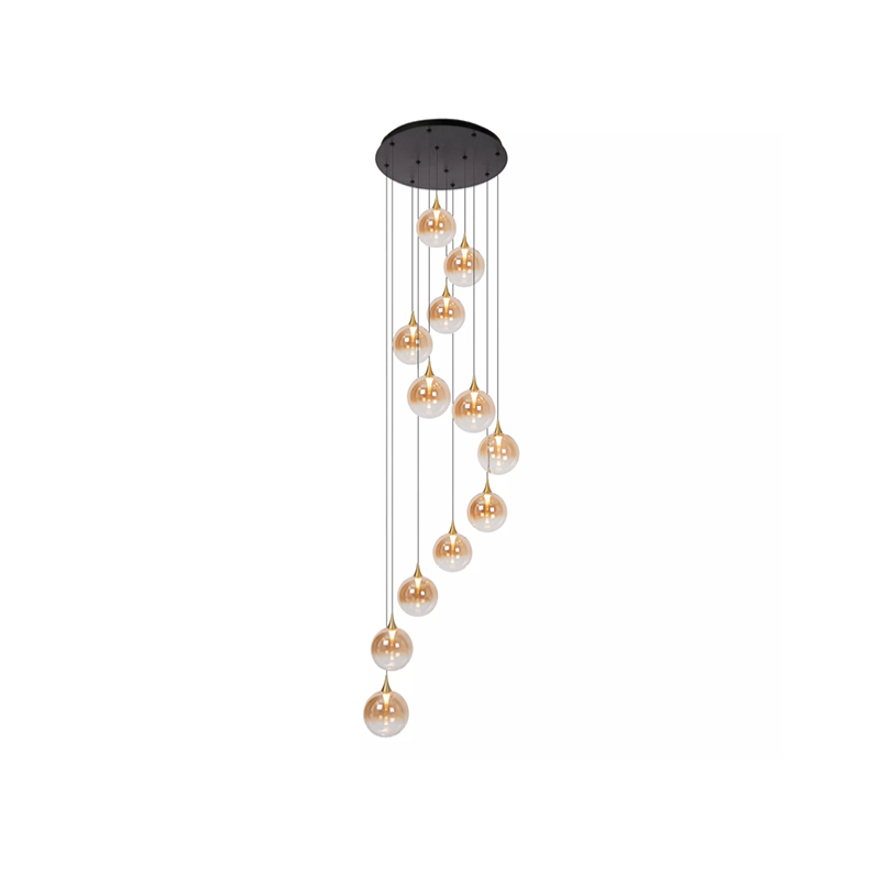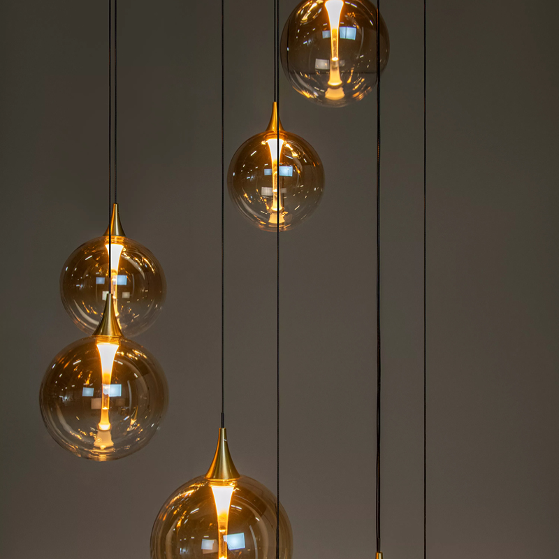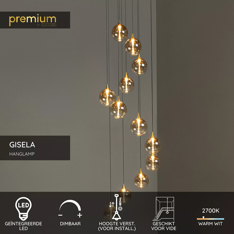 Gisela is een hanglamp die uit verschillende pendels met heldere, amberkleurige glazen bollen bestaat, die elk verstelbaar zijn in hoogte. De geïntegreerde ledlampen zijn dimbaar en verspreiden een warm wit licht. Dit tijdloze bolvormig ontwerp doet het goed in zowel klassieke interieurs als moderne vormgevingen. Of je ze nu op gelijke hoogte of speels aflopend ophangt: scoren doe je met deze elegante hanglamp altijd.