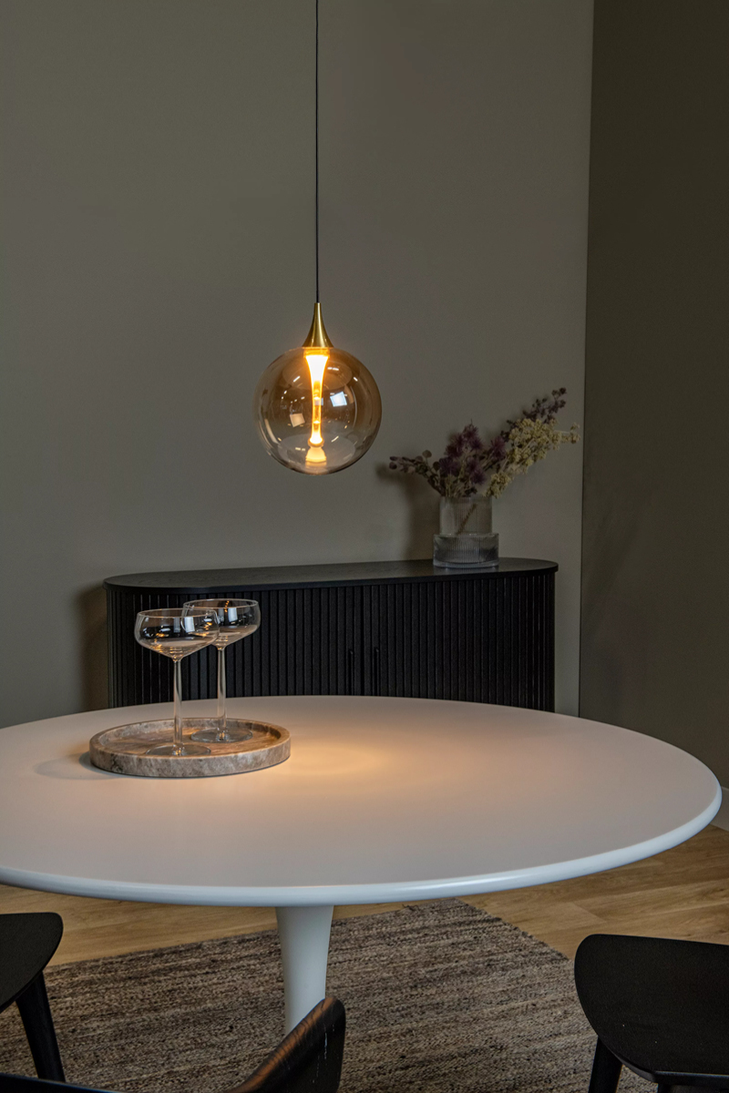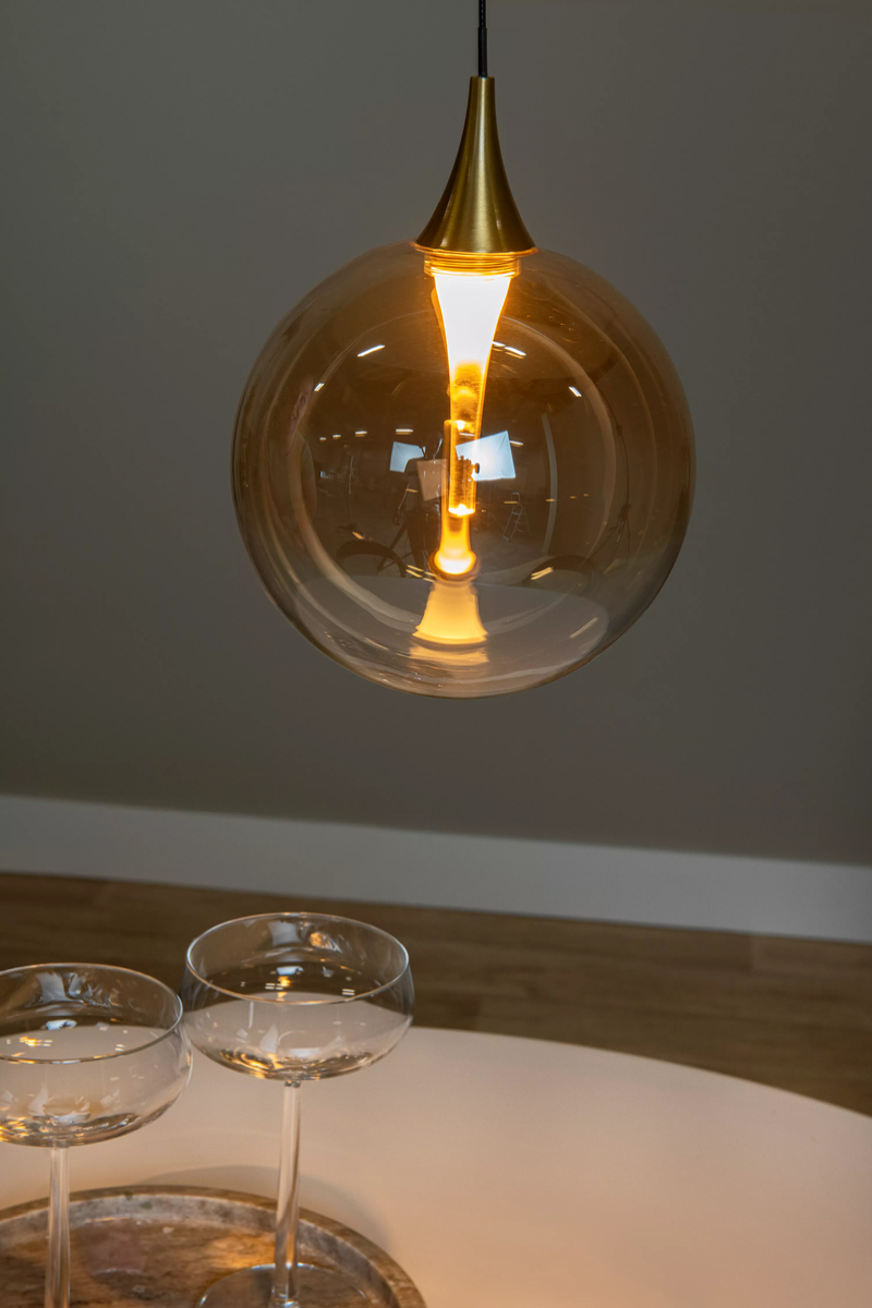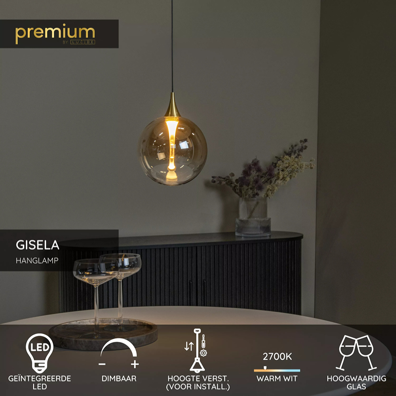 Gisela is een 1-lichts hanglamp met een heldere, amberkleurige glazen bol die in hoogte verstelbaar is. De geïntegreerde ledlamp is dimbaar en verspreidt een warm wit licht. Het tijdloze, bolvormige ontwerp komt prachtig tot zijn recht in zowel klassieke interieurs als moderne vormgevingen. Of je de lamp nu subtiel boven een tafel, in de hal of naast het bed hangt: met deze elegante hanglamp zit je altijd goed.