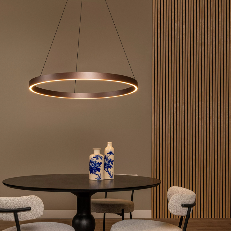De hanglamp Liane combineert een moderne uitstraling met praktisch gebruiksgemak. De elegante ronde vorm zorgt voor een stijlvolle blikvanger boven de eettafel. De lamp is uitgerust met geïntegreerde dimbare LED-verlichting, waarbij de kleurtemperatuur eenvoudig instelbaar is via een ingebouwde DIP-schakelaar (2700K–4000K). Dankzij het slimme katrolsysteem is de hoogte moeiteloos aan te passen, zodat de verlichting altijd perfect aansluit bij elke setting. Een moderne, functionele en sfeervolle keuze voor in de eetkamer.