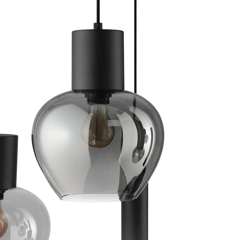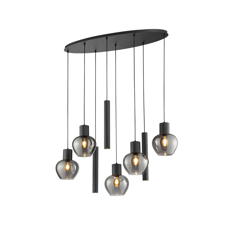 De Ligari hanglamp is een moderne 8-lichts lamp met stijlvolle smoke glazen kappen en een strakke zwarte afwerking. Dankzij 5 x E27 en 3 x GU10 lichtpunten en een ovale plafondplaat zorgt de lamp voor sfeervol en functioneel licht boven bijvoorbeeld de eettafel.