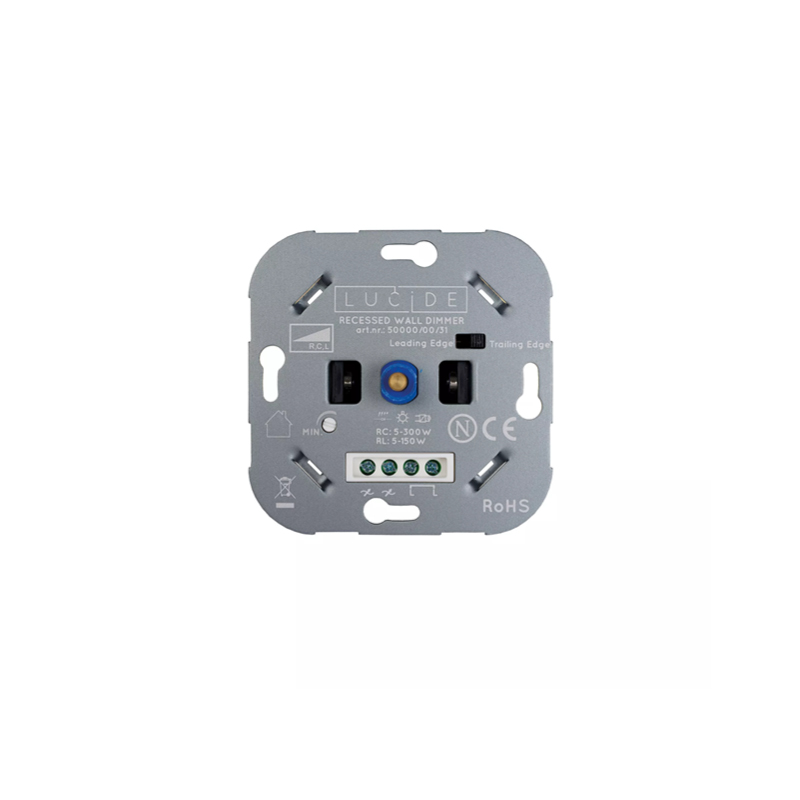 Tip: Maak eerst een proefopstelling. Flikkeren of zoemen van de lampen, transformator en/of dimmer duidt op een verkeerde match. Test dit zónder de dimmer in de muur vast te schroeven. Wees je tevens altijd bewust van de minimale en maximale belasting van de dimmer (zie max Wattage RC/RL). Kijk goed naar je wandcontactdoos, de Lucide LED enkel geschikt voor reguliere inbouwdozen met schroefgaten. Er worden geen losse inbouwklemmen meegeleverd, waardoor de dimmer niet geschikt is voor inbouwdozen zonder schroefgaten.